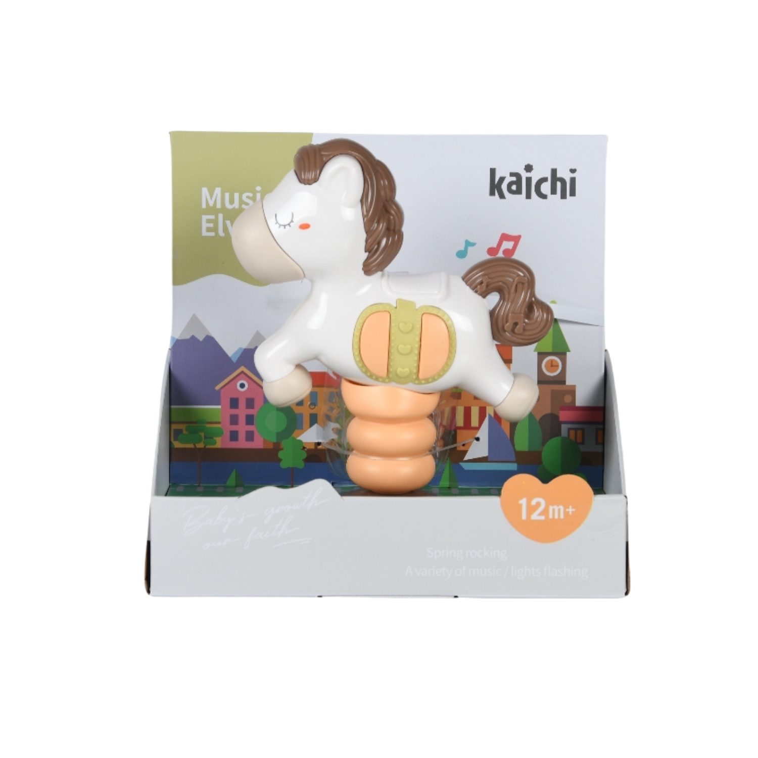 Παιχνίδι αλογάκι Kaichi με φωτάκι, μουσική και βεντούζα για σταθερή τοποθέτηση, ιδανικό για παιδιά 12+ μηνών, που ενισχύει την αισθητηριακή ανάπτυξη και τον συντονισμό μέσα από το παιχνίδι.