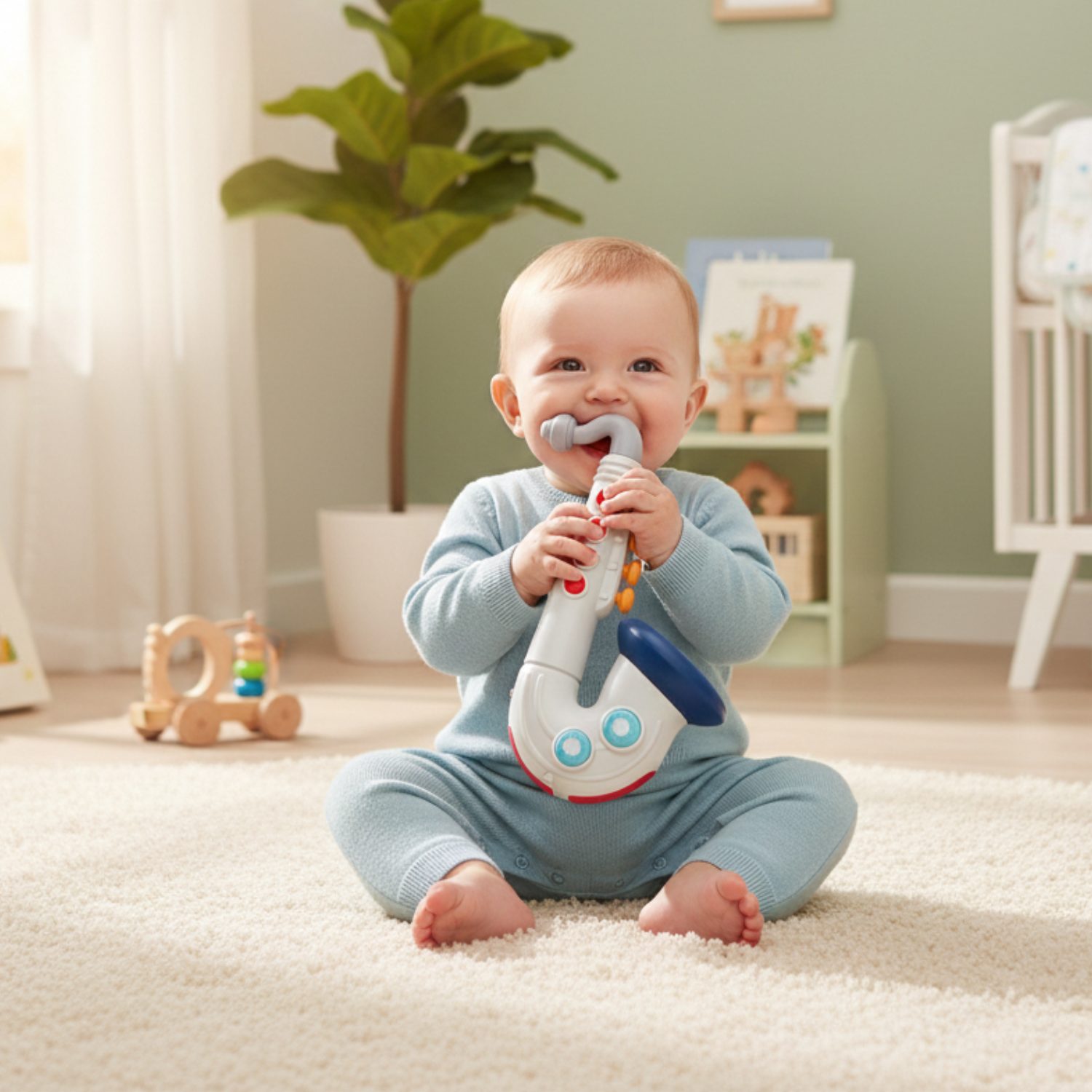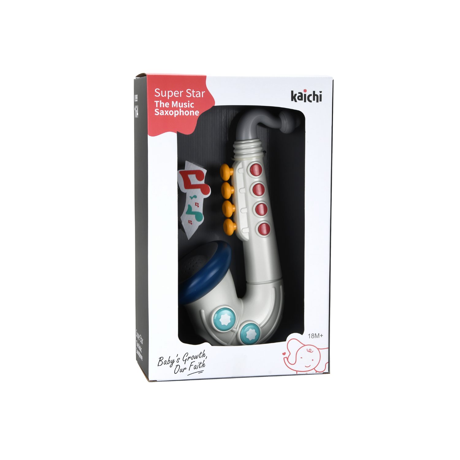 Ηλεκτρονικό σαξόφωνο Kaichi για μωρά 12+ μηνών, με πολύχρωμα πλήκτρα και χαρούμενους ήχους, που ενισχύει τη μουσική ακοή, τη λεπτή κινητικότητα και τη συγκέντρωση μέσα από το παιχνίδι.
